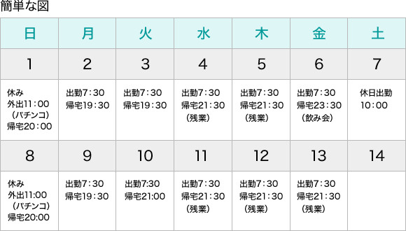 ・出勤7:30 ・帰宅23:30 (飲み会) |